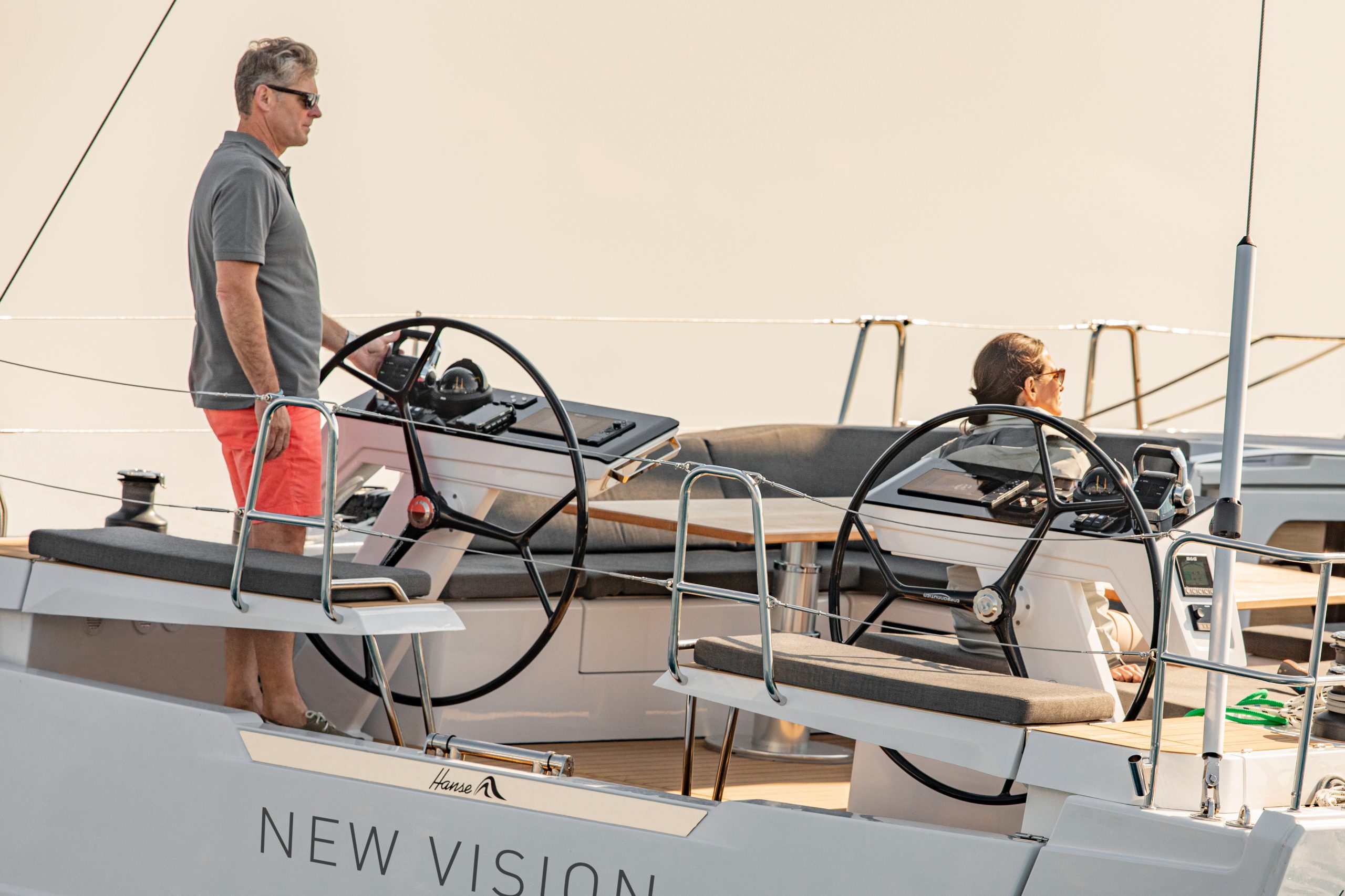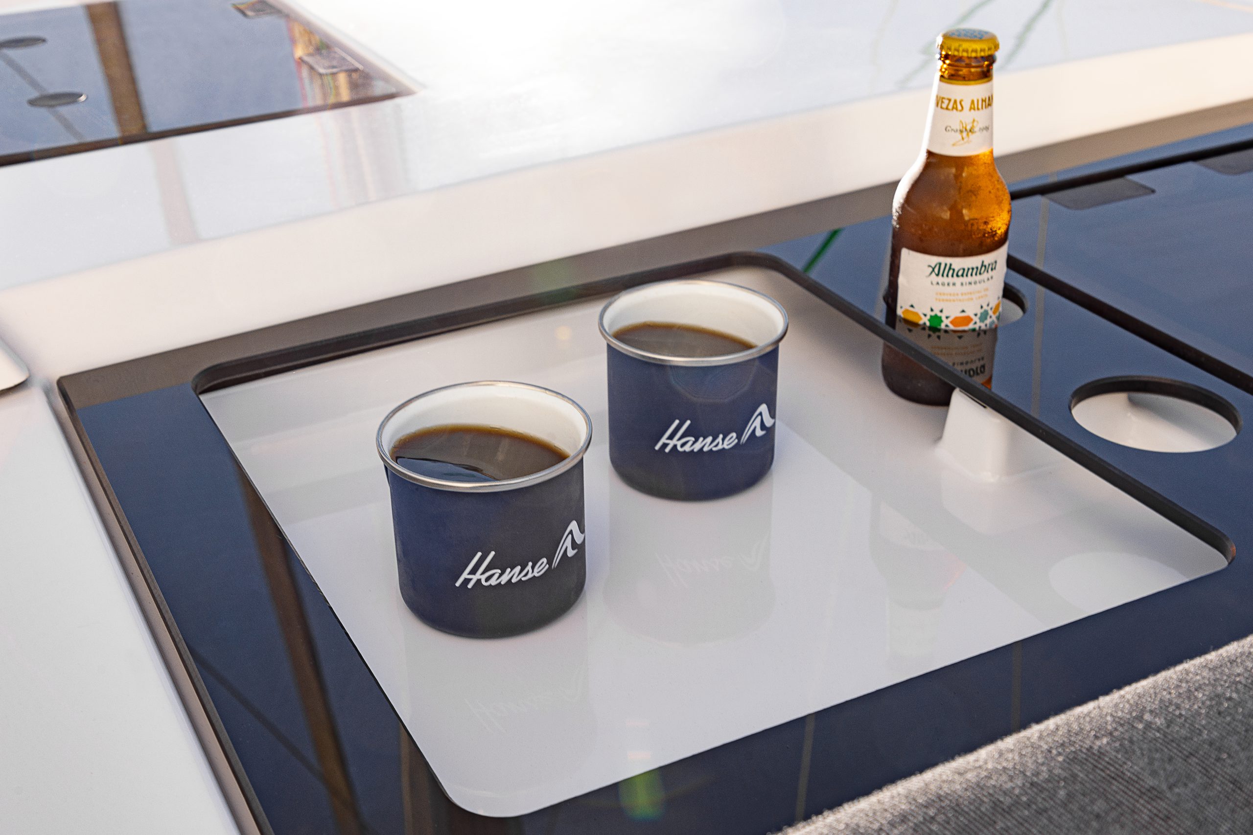 - Cockpit table with teak top, electrically lowerable into sunbed on stb and ps (on stb also cockpit bench extension)